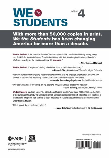 We the Students is a highly acclaimed resource that has introduced thousands of students to the field of legal studies by covering Supreme Court issues that directly affect them. It examines topics such as students’ access to judicial process; religion in schools; school discipline and punishment; and safety, discrimination and privacy at school. Through meaningful and engagingly written commentary, excerpts of Supreme Court cases (with students as the litigants), and exercises and class projects, author Jamie B. Raskin provides students with the tools they need to gain a deeper appreciation of democratic freedoms and challenges, and underscores their responsibility in preserving constitutional principles. Completely revised and updated, the new, Fourth Edition of We the Students incorporates new Supreme Court cases, new examples, and new exercises to bring constitutional issues to life.