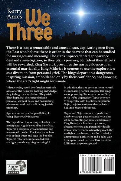 There is a star, a remarkable and unusual star, captivating men from the East who believe there is order in the heavens that can be studied for messages and meaning. The star's unprecedented appearance demands investigation, so they plan a journey, confident their efforts will be rewarded. King Xaratuk presumes the star is evidence of an essential martial ally. King Mithrias is content to use the exploration as a diversion from personal grief. The kings depart on a dangerous, inspiring mission, emboldened only by their confidence, not knowing where the star's light might terminate. What or who could be of such magnitude as to alter the heavens? Lacking knowledge, they indulge in speculation. They wish. They hope. But their speculation is personal, without basis, and has nothing whatsoever to do with validating Jewish prophecy. Speculation carries the possibility of being disastrously incorrect. The expedition has journeyed farther than anticipated. A guide would be beneficial. Topur is a diaspora Jew, a merchant, and a seasoned traveler. The kings invite him to join their quest and reap the benefits. Topur is reluctant, unpersuaded that starlight reveals anything meaningful. In addition, the star beckons them toward the menacing Roman Empire. The kings see opportunity; Topur sees doom. Only at his wife's urging does Topur concede to cooperate. With his slave companion, Najiir, he joins a mission that he feels has little chance of success. Topur and Najiir attempt to guide their notable charges past a chaotic Jerusalem while confronting an erratic and sinister King Herod, a scheming royal court, obstinate clerics, and potentially deadly Roman interference. When they reach the starlight's conclusion, they find a wholly unimpressive Bethlehem and a baby with his impoverished parents. This is not the fulfillment anyone expected.