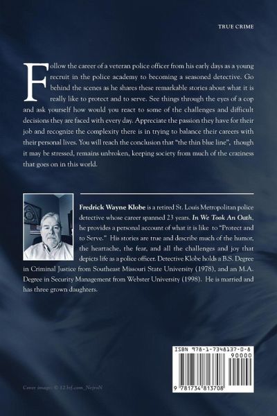 Almost everyone has seen the words "To Protect and to Serve" on the side of police cars and generally takes that logo for granted. We think, "Of course they are supposed to protect and serve their community, that's their job". However, much more goes along with those expectations the public has of police officers. Although police offices can find themselves consumed by their careers, they have a personal side that cannot be turned on or off simply by flipping a switch. They have personal relationships, raise and support families, are members of church or community groups; things people do that becomes part of their everyday routine. In "We Took An Oath", you go behind the scenes with Fredrick "Wayne" Klobe, a veteran police officer who chronicles his journey from rookie trainee in the police academy, to patrol officer and baptism by fire in the Third Police District, one of St. Louis' largest and busiest districts, to becoming a seasoned detective during the second half of his twenty-three-year career. See things through his eyes and try to imagine some of the horrific, tragic, and unbelievable events that took place during his time on the force. Some of these stories are as humorous as they are disturbing. Aside from describing in detail events that most people want to hear about but would never want to be a part of, Detective Klobe talks about the emotional impact these events have on police officers. Some situations might appear to be rather routine, but in police work nothing is ever really routine, while others can give even the most veteran officers a dose of "shock and awe". No matter how hard they try, police officers cannot avoid the emotional roller coaster associated with the stress of their job. What matters is how well they deal with it. Detective Klobe opens up about his personal life and shares some of the triumphs and the tragedies that shaped the direction it took.