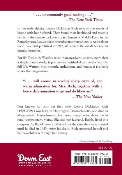 In her early thirties, Louise Dickinson Rich took to the woods of Maine with her husband. They found their livelihood and raised a family in the remote backcountry settlement of Middle Dam, in the Rangeley area. Rich made time after morning chores to write about their lives. We Took to the Woods is an adventure story, written with humor, but it also portrays a cherished dream awakened into full life. First published 1942.
