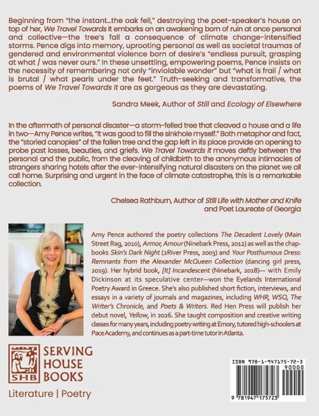 Advance praise for We Travel Towards It Beginning from "the instant...the oak fell," destroying the poet-speaker's house on top of her, We Travel Towards It embarks on an awakening born of ruin at once personal and collective-the tree's fall a consequence of climate change-intensified storms. Pence digs into memory, uprooting personal as well as societal traumas of gendered and environmental violence born of desire's "endless pursuit, grasping at what / was never ours." In these unsettling, empowering poems, Pence insists on the necessity of remembering not only "inviolable wonder" but "what is frail / what is brutal / what pearls under the feet." Truth-seeking and transformative, the poems of We Travel Towards It are as gorgeous as they are devastating.-Sandra Meek, Author of Still and Ecology of ElsewhereIn the aftermath of personal disaster-a storm-felled tree that cleaved a house and a life in two-Amy Pence writes, "It was good to fill the sinkhole myself." Both metaphor and fact, the "storied canopies" of the fallen tree and the gap left in its place provide an opening to probe past losses, beauties, and griefs. We Travel Towards It moves deftly between the personal and the public, from the cleaving of childbirth to the anonymous intimacies of strangers sharing hotels after the ever-intensifying natural disasters on the planet we all call home. Surprising and urgent in the face of climate catastrophe, this is a remarkable collection.-Chelsea Rathburn, Author of Still Life with Mother and Knife and Poet Laureate of Georgia