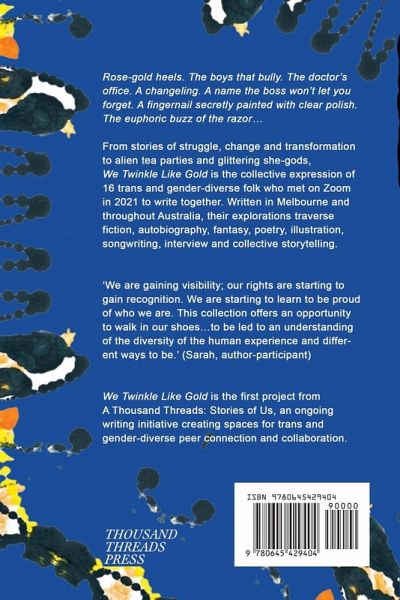 Rose-gold heels. The boys that bully. The doctor's office. A changeling. A name the boss won't let you forget. A fingernail secretly painted with clear polish. The euphoric buzz of the razor... From stories of struggle, change and transformation to alien tea parties and glittering she-gods, We Twinkle Like Gold is the collective expression of 16 trans and gender-diverse folk who met on Zoom in 2021 to write together. Written in Melbourne and throughout Australia, their explorations traverse fiction, autobiography, fantasy, poetry, illustration, songwriting, interview and collective storytelling. 'We are gaining visibility; our rights are starting to gain recognition. We are starting to learn to be proud of who we are. This collection offers an opportunity to walk in our shoes... to be led to an understanding of the diversity of the human experience and different ways to be. (Sarah, author-participant) We Twinkle Like Gold is the first project from A Thousand Threads: Stories of Us, an ongoing writing initiative creating spaces for trans and gender-diverse peer connection and collaboration.