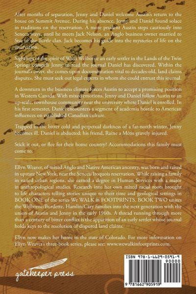 After months of separation, Jenny and Daniel welcome Austin's return to the house on Summit Avenue. During his absence, Jenny and Daniel found solace in traditions on the reservation. A more prudent Austin steps cautiously into Seneca ways, until he meets Jack Nelson, an Anglo business owner married to Star of the Turtle clan. Jack becomes his guide into the mysteries of life on the reservation. Sightings of the spirit of Wren Welborne an early settler in the Lands of the Twin Springs compels Jenny to read the journal Daniel has discovered. Within the journal's cover, she comes upon documentation vital to decades-old, land claims disputes. She must seek out legal experts in whom she could entrust this journal. A downturn in the business climate forces Austin to accept a promising position in Western Canada. With mixed emotions, Jenny and Daniel follow Austin to an up-scale, townhouse community near the university where Daniel is enrolled. In his first semester, Daniel encounters a segment of academia hostile to American influences on established Canadian culture. Trapped in the bitter cold and perpetual darkness of a far-north winter, Jenny becomes ill. Daniel is abducted; his friend, Raine a Métis gravely injured. Stick it out, or flee for their home country? Accommodations this family must come to.