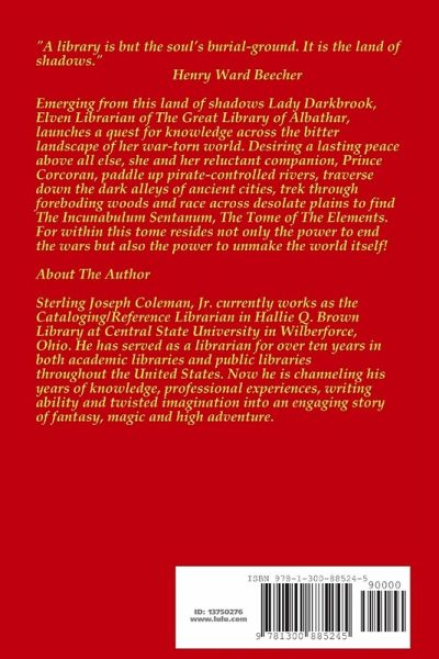 "A library is but the soul's burial-ground. It is the land of shadows." Henry Ward Beecher Emerging from this land of shadows Lady Darkbrook, Elven Librarian of The Great Library of Albathar, launches a quest across the bitter landscape of her war-torn world to find the first of four magical tomes. Desiring a lasting peace above all else, she and her reluctant companion, Prince Corcoran, travel up pirate-controlled rivers, traverse down the dark alleys of ancient cities, trek through foreboding woods and race across desolate plains to find The Incunabulum Sentanum, The Tome of The Elements. For within this tome resides not only the power to end the wars but also the power to unmake the world itself!