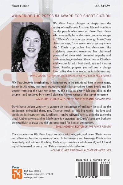 Jennifer S. Davis's linked collection, We Were Angry, winner of the Press 53 Award for Short Fiction, introduces us to a group of friends in small-town Alabama whose lives are haunted by tragedies that reverberate across generations. In Davis's world, Alabama is more than a fictional setting. It's a scene for interrogating power, privilege, pain, and what it means to live in-and to leave-the American South. In lyrical, urgent prose shot through with dark humor, Davis offers glimpses of a land of contradictions: dollar stores and golf courses, dive bars and country clubs, and long-forgotten communities flooded to make way for mansions where missing women are rumored to be buried. Traversing these red dirt roads we find mothers and mourners, rebels and addicts, lovers, liars, prisoners, politicians, theme park enthusiasts, and collectors of rejected house pets-and we may be most surprised to find ourselves, "shocked . . . to see our own anguish staring, unblinking, back at us" like an uncanny face in the mirror we will not soon forget.