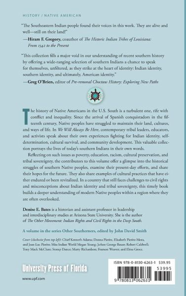 The history of Native Americans in the U.S. South is a turbulent one, rife with conflict and inequality. Since the arrival of Spanish conquistadors in the fifteenth century, Native peoples have struggled to maintain their land, cultures, and ways of life. In We Will Always Be Here, contemporary tribal leaders, educators, and activists share their struggles for Indian identity, self-determination, and community development. Reflecting on such issues as poverty, education, racism, cultural preservation, and tribal sovereignty, the contributors to this volume offer a glimpse into the historical struggles of southern Native peoples, examine their present day efforts, and share their hopes for the future. They also share examples of cultural practices that have either endured or been revitalized. In a country that still faces challenges to civil rights and misconceptions about Indian identity and tribal sovereignty, this timely book builds a deeper understanding of modern Native peoples within a region where they are often overlooked.
