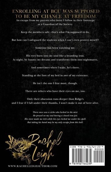 Enrolling at BCU was supposed to be my chance at freedom. An escape from my parents who insist I follow in their footsteps as a Guardian of the Society. Keep the members safe-that's what I'm supposed to do. But how can I safeguard the students when I can't even protect myself? Someone has been watching me. His eyes burn into my soul like a branding iron. At night, he haunts my dreams and transforms them into nightmares. And sometimes when I wake, he's there. Standing at the foot of my bed in awe of my existence. He isn't the one I fear most, though. There are others who have their eyes on me, too. Only their obsession runs deeper than Ridge's and I fear if I fall under their thumbs, I won't make it out of here alive. There once was a sicko who lurked in the mist. He preyed on my soul baring a closed iron fist. His stare made me itch while his eyes locked me under his spell. But taking his hand may be my only escape from this hell.