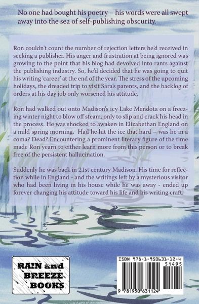 No one had bought his poetry - his words were all swept away into the sea of self-publishing obscurity. Ron couldn't count the number of rejection letters he'd received in seeking a publisher. His anger and frustration at being ignored was growing to the point that his blog had devolved into rants against the publishing industry. So, he'd decided that he was going to quit his writing 'career' at the end of the year. The stress of the upcoming holidays, the dreaded trip to visit Sara's parents, and the backlog of orders at his day job only worsened his attitude. Ron had walked out onto Madison's icy Lake Mendota on a freezing winter night to blow off steam, only to slip and crack his head in the process. He was shocked to awaken in Elizabethan England on a mild spring morning. Had he hit the ice that hard - was he in a coma? Dead? Encountering a prominent literary figure of the time made Ron yearn to either learn more from this person or to break free of the persistent hallucination. Suddenly he was back in 21st century Madison. His time for reflection while in England - and the writings left by a mysterious visitor who had been living in his house while he was away - ended up forever changing his attitude toward his life and his writing craft.