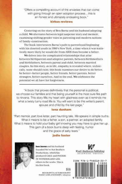 we: an adoption and a memoir centers on the story of Barnz adopting a child and the legal battle with the birthfather that began the day after the child’s birth – and two days before 9/11. The book interweaves this narrative with Barnz’s path to parenthood – beginning with his closeted youth in 1980’s New York, a time when it was statistically more likely he would die from AIDS than become a father. Alternating between legal suspense story and memoir, we examines shifting gender roles in parenting as well as modern notions of family-construction, but ultimately we is a personal narrative with universal appeal. It delves into the complicated relationships that arise between birthparents and adoptive parents, between birthmothers and birthfathers, between parent and child, between married couples. In this story, as in life, empathy is revealed where, technically, none should exist; this book examines our desire to do better, be better– better people, better friends, better parents, better strangers, better ourselves. And in the end, it celebrates the potential we all have for forgiveness. Independent film producer Ben Barnz and his husband, filmmaker Daniel Barnz, make up "We’re Not Brothers Productions" and have written, directed and produced the films Cake and Phoebe in Wonderland. They are currently developing an HBO pilot with Lena Dunham and a feature film with Brad Pitt’s Plan B about Ryan Wash, an openly gay black debate champion.