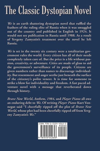We is an earth shattering dystopian novel that ruffled the feathers of the ruling elite of Russia when it was smuggled out of the country and published in English in 1924. It would not see publication in Russia until 1988. As a result of Yevgeny Zamyatin's treatment over the novel he left Russia. We is set in the twenty sixth century where a totalitarian government rules the world. Every citizen has all of their needs completely taken care of. But the price is a life without passion, creativity, or adventure. Cities are made of glass to aid the government's surveillance of its people. Citizens are given numbers rather than names to discourage individuality. But resentment and anger seethe just beneath the surface of the citizenry's polite veneer. It is time for someone to strike a blow for individuality and freedom. A fast paced adventure novel with a message that reverberated down through history. Brave New World, Anthem, 1984, and Player Piano all owe an enduring debt to We. Of writing Player Piano Kurt Vonnegut said "I cheerfully ripped off the plot of Brave New World, whose plot had been cheerfully ripped off from Yevgeny Zamyatin's We."