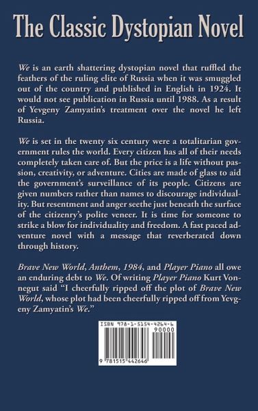 We is an earth shattering dystopian novel that ruffled the feathers of the ruling elite of Russia when it was smuggled out of the country and published in English in 1924. It would not see publication in Russia until 1988. As a result of Yevgeny Zamyatin's treatment over the novel he left Russia. We is set in the twenty six century were a totalitarian government rules the world. Every citizen has all of their needs completely taken care of. But the price is a life without passion, creativity, or adventure. Cities are made of glass to aid the government's surveillance of its people. Citizens are given numbers rather than names to discourage individuality. But resentment and anger seethe just beneath the surface of the citizenry's polite veneer. It is time for someone to strike a blow for individuality and freedom. A fast paced adventure novel with a message that reverberated down through history. Brave New World, Anthem, 1984, and Player Piano all owe an enduring debt to We. Of writing Player Piano Kurt Vonnegut said "I cheerfully ripped off the plot of Brave New World, whose plot had been cheerfully ripped off from Yevgeny Zamyatin's We."