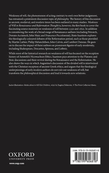 The question of why people act against their better judgment has always been prominent in philosophy. Risto Saarinen presents the first study of ideas about weakness of the will between 1350 and 1650. He shows how the understanding of human conduct and free will changed in this formative period between medieval times and modernity.