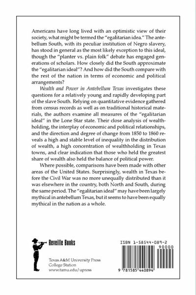 Americans have long lived with an optimistic view of their society, what might be termed the "egalitarian idea." The antebellum South, with its peculiar institution of Negro slavery, has stood in general as the most likely exception to this ideal, though the "planter vs. plain folk" debate has engaged generations of scholars. How closely did the South approximate the "egalitarian ideal"? And how did the South compare with the rest of the nation in terms of economic and political arrangements? Wealth and Power in Antebellum Texas investigates these questions for a relatively young and rapidly developing part of the slave South. Relying on quantitative evidence gathered from census records as well as on traditional historical materials, the authors examine all measures of the "egalitarian ideal" in the Lone Star state. Their close analysis of wealthholding, the interplay of economic and political relationships, and the direction and degree of change from 1850 to 1860 reveals a high and stable level of inequality in the distribution of wealth, a high concentration of wealthholding in Texas towns, and clear indication that those who held the greatest share of wealth also held the balance of political power. Where possible, comparisons have been made with other areas of the United States. Surprisingly, wealth in Texas before the Civil War was no more unequally distributed than it was elsewhere in the country, both North and South, during the same period. The "egalitarian ideal" may have been largely mythical in antebellum Texas, but it seems to have been equally mythical in the nation as a whole.
