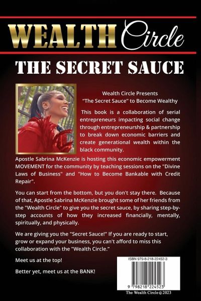 Wealth Circle Presents "The Secret Sauce" to Become Wealthy This book is a collaboration of serial entrepreneurs impacting social change through entrepreneurship & partnership to break down economic barriers and create generational wealth within the black community. Apostle Sabrina McKenzie is hosting this economic empowerment MOVEMENT for the community by teaching sessions on the "Divine Laws of Business" and "How to Become Bankable with Credit Repair". You can start from the bottom, but you don't stay there. Because of that, Apostle Sabrina McKenzie brought some of her friends from the "Wealth Circle" to give you the secret sauce, by sharing step-by-step accounts of how they increased financially, mentally, spiritually, and physically. We are giving you the "Secret Sauce!" If you are ready to start, grow or expand your business, you can't afford to miss this collaboration with the "Wealth Circle." Meet us at the top! Better yet, meet us at the BANK!