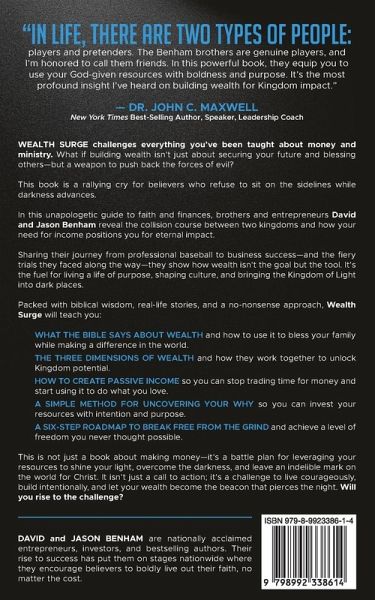 WEALTH SURGE challenges everything you've been taught about money and ministry. What if building wealth isn't just about securing your future and blessing others-but a weapon to push back the forces of evil? This book is a rallying cry for believers who refuse to sit on the sidelines while darkness advances. In this unapologetic guide to faith and finances, brothers and entrepreneurs David and Jason Benham reveal the collision course between two kingdoms and how your need for income positions you for eternal impact. Sharing their journey from professional baseball to business success-and the fiery trials they faced along the way-they show how wealth isn't the goal but the tool. It's the fuel for living a life of purpose, shaping culture, and bringing the Kingdom of Light into dark places. Packed with biblical wisdom, real-life stories, and a no-nonsense approach, Brace for Impact will teach you: 1. What the Bible says about wealth and how to use it to bless your family while making a difference in the world. 2. The three dimensions of wealth and how they work together to unlock Kingdom potential. 3. How to create passive income so you can stop trading time for money and start using it to do what you love. 4. A simple method for uncovering your why so you can invest your resources with intention and purpose. 5. A six-step roadmap to break free from the grind and achieve a level of freedom you never thought possible. This is not just a book about making money - it's a battle plan for leveraging your resources to shine your light, overcome the darkness, and leave an indelible mark on the world for Christ. It isn't just a call to action; it's a challenge to live courageously, build intentionally, and let your wealth become the beacon that pierces the night. Will you rise to the challenge?