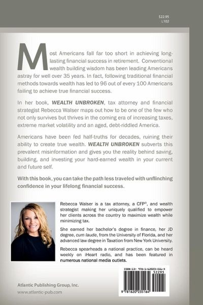 Most Americans fall far too short in achieving long-lasting financial success in retirement. Conventional wealth building wisdom has been leading Americans astray for well over 35 years. In fact, following traditional financial methods towards wealth has led to 96 out of every 100 Americans failing to achieve true financial success.In her book, WEALTH UNBROKEN, Tax attorney and financial strategist Rebecca Walser maps out how to be one of the few who not only survives but thrives in the coming era of increasing taxes, extreme market volatility and an aged, debt-riddled America. Americans have been fed half-truths for decades, ruining their ability to create true wealth. WEALTH UNBROKEN subverts this prevalent misinformation and gives you the reality behind saving, building, and investing your hard-earned wealth in your current and future self. With this book, you can take the path less traveled with unflinching confidence in your lifelong financial success.