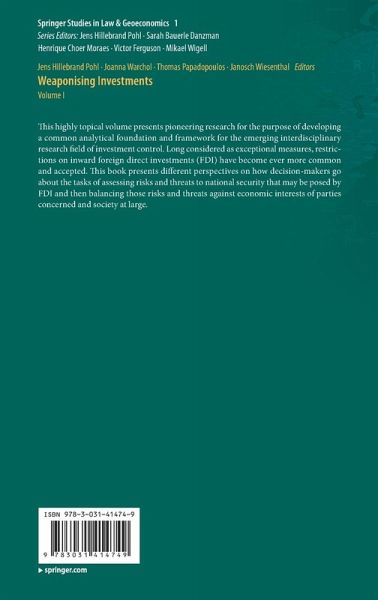 This highly topical volume presents pioneering research for the purpose of developing a common analytical foundation and framework for the emerging interdisciplinary research field of investment control. Long considered as exceptional measures, restrictions on inward foreign direct investments (FDI) have become ever more common and accepted. This book presents different perspectives on how decision-makers go about the tasks of assessing risks and threats to national security that may be posed by FDI and then balancing those risks and threats against economic interests of parties concerned and society at large. …mehr