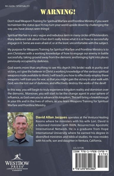WARNING! Don't read Weapon's Training for Spiritual Warfare and Frontline Ministry if you want to maintain the status quo! It may turn your world upside down by challenging the way you have always seen things! Spiritual Warfare is a very vague and nebulous term in many circles of Christendom. Many believers talk about it but don't really know what it is or how to successfully engage in it. Some are even afraid of, or at the least, uncomfortable with the subject. My purpose for Weapons Training for Spiritual Warfare and Frontline Ministry is to arm Christians with a working knowledge of how to engage our enemy in battle successfully, taking ground away from the demonic and bringing light into places previously occupied by darkness. God wants more than anything to see His church (His bride) walk in purity and victory, so I give the believer in Christ a working knowledge of the various spiritual weapons made available to them. I will teach you how to effectively employ these weapons. I will train you for war, so that you might gain the victory in your walk with God; win the lost out of darkness, and effectively destroy the works of the devil! In this way, you will begin to truly experience kingdom reality and dominion over the demonic. Moreover, you will start to be the change agent in your sphere of influence, as God uses you to advance His kingdom. This will bring a breakthrough in your life and in the lives of others, as you learn Weapons Training for Spiritual Warfare and Frontline Ministry.
