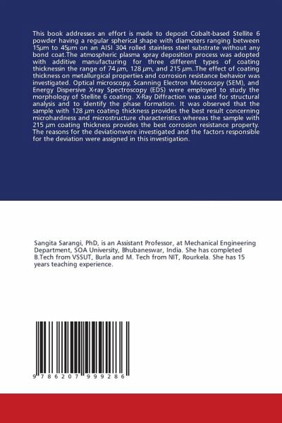 This book addresses an effort is made to deposit Cobalt-based Stellite 6 powder having a regular spherical shape with diameters ranging between 15µm to 45µm on an AISI 304 rolled stainless steel substrate without any bond coat.The atmospheric plasma spray deposition process was adopted with additive manufacturing for three different types of coating thicknessin the range of 74 µm, 128 µm, and 215 µm..The effect of coating thickness on metallurgical properties and corrosion resistance behavior was investigated. Optical microscopy, Scanning Electron Microscopy (SEM), and Energy Dispersive X-ray Spectroscopy (EDS) were employed to study the morphology of Stellite 6 coating. X-Ray Diffraction was used for structural analysis and to identify the phase formation. It was observed that the sample with 128 µm coating thickness provides the best result concerning microhardness and microstructure characteristics whereas the sample with 215 µm coating thickness provides the best corrosion resistance property. The reasons for the deviationwere investigated and the factors responsible for the deviation were assigned in this investigation.