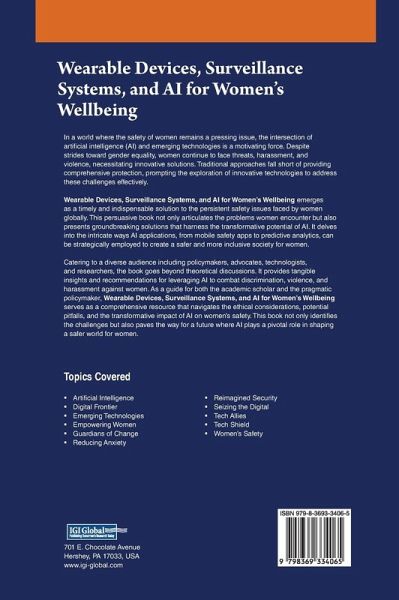 In a world where the safety of women remains a pressing issue, the intersection of artificial intelligence (AI) and emerging technologies is a motivating force. Despite strides toward gender equality, women continue to face threats, harassment, and violence, necessitating innovative solutions. Traditional approaches fall short of providing comprehensive protection, prompting the exploration of innovative technologies to address these challenges effectively. Wearable Devices, Surveillance Systems, and AI for Women's Wellbeing emerges as a timely and indispensable solution to the persistent safety issues faced by women globally. This persuasive book not only articulates the problems women encounter but also presents groundbreaking solutions that harness the transformative potential of AI. It delves into the intricate ways AI applications, from mobile safety apps to predictive analytics, can be strategically employed to create a safer and more inclusive society for women.