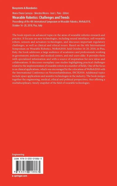 The book reports on advanced topics in the areas of wearable robotics research and practice. It focuses on new technologies, including neural interfaces, soft wearable robots, sensors and actuators technologies, and discusses important regulatory challenges, as well as clinical and ethical issues. Based on the 4th International Symposium on Wearable Robotics, WeRob2018, held October 16-20, 2018, in Pisa, Italy, the book addresses a large audience of academics and professionals working in government, industry, and medical centers, and end-users alike. It provides them with specialized information and with a source of inspiration for new ideas and collaborations. It discusses exemplary case studies highlighting practical challenges related to the implementation of wearable robots in a number of fields. One of the focus is on clinical applications, which was encouraged by the colocation of WeRob2018 with the International Conference on Neurorehabilitation, INCR2018. Additional topics include space applications and assistive technologies in the industry. The book merges together the engineering, medical, ethical and political perspectives, thus offering a multidisciplinary, timely snapshot of the field of wearable technologies.
