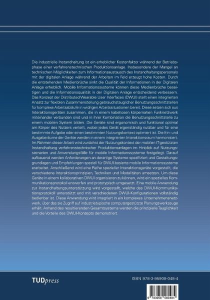 Die industrielle Instandhaltung ist ein erheblicher Kostenfaktor während der Betriebsphase einer verfahrenstechnischen Produktionsanlage. Insbesondere der Mangel an technischen Möglichkeiten zum Informationsaustausch des Instandhaltungspersonals mit der digitalen Anlage während der Arbeiten im Feld erzeugt hohe Kosten. Durch die entstehenden Medienbrüche sinkt die Qualität der Informationen in der Digitalen Anlage erheblich. Mobile Informationssysteme können diese Medienbrüche beseitigen und die Informationsqualität in der Digitalen Anlage entscheidend verbessern. Das Konzept der Distributed Wearable User Interfaces (DWUI) stellt einen integrierten Ansatz zur flexiblen Zusammenstellung gebrauchstauglicher Benutzungsschnittstellen für komplexe Arbeitsabläufe in widrigen Arbeitssituationen bereit. Diese setzen sich aus Interaktionsgeräten zusammen, die in einem kabellosen körpernahen Funknetzwerk miteinander verbunden sind und in ihrer Kombination die Benutzungsschnittstelle zu einem mobilen System bilden. Die Geräte sind ergonomisch und funktional optimal am Körper des Nutzers verteilt, wobei jedes Gerät eigenständig nutzbar und für eine bestimmte Aufgabe oder einen bestimmten Nutzungskontext optimiert ist. Die Ein- und Ausgaberäume der Geräte werden in einem integrierten Interaktionsraum harmonisiert.Im Rahmen dieser Arbeit wird zunächst der Nutzungskontext der mobilen IT-gestützten Instandhaltung verfahrenstechnischer Produktionsanlagen im Hinblick auf Nutzungsszenarien und Anwendungsfälle für mobile Informationssysteme festgelegt. Darauf aufbauend werden Anforderungen an derartige Systeme spezifiziert und Gestaltungsgrundlagen und Empfehlungen speziell für DWUI-basierte mobile Informationssysteme erarbeitet. Anschließend wird eine Reihe spezieller Interaktionsgeräte vorgestellt, die verschiedene Interaktionsprinzipien, Techniken und Modalitäten umsetzen. Um diese Geräte in einem kollaborativen DWUI organisieren zu können, wird ein spezielles Kommunikationsprotokoll entworfen und prototypisch umgesetzt. Eine mobile Anwendung zur Instandhaltungsunterstützung wird vorgestellt, welche das DWUI-Kommunikationsprotokoll unterstützt und mit verschiedenen DWUI-Konfigurationen vollständig bedienbar ist. Diese Anwendung wird integriert in ein komplexes Unternehmensnetzwerk, über das sie Zugriff auf industrietypische computergestützte Planungswerkzeuge erhält. Anhand des resultierenden Gesamtsystems werden die prinzipielle Tauglichkeit und die Vorteile des DWUI-Konzepts demonstriert.