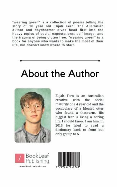 "wearing green" is a collection of poems telling the story of 16 year old Elijah Fern. The Australian author and daydreamer dives head first into the heavy topics of social expectations, self image, and the trauma of being gluten free. "wearing green" is a book for anyone who wants to make the most of their life, but doesn't know where to start.
