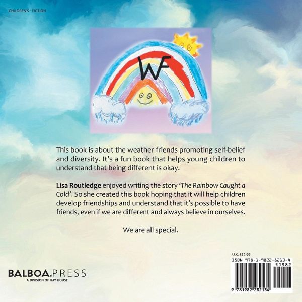 This book is about the weather friends promoting self-belief and diversity. It's a fun book that helps young children to understand that being different is okay. Lisa Routledge enjoyed writing the story 'The Rainbow Caught a Cold'. So she created this book hoping that it will help children develop friendships and understand that it's possible to have friends, even if we are different and always believe in ourselves. We are all special.