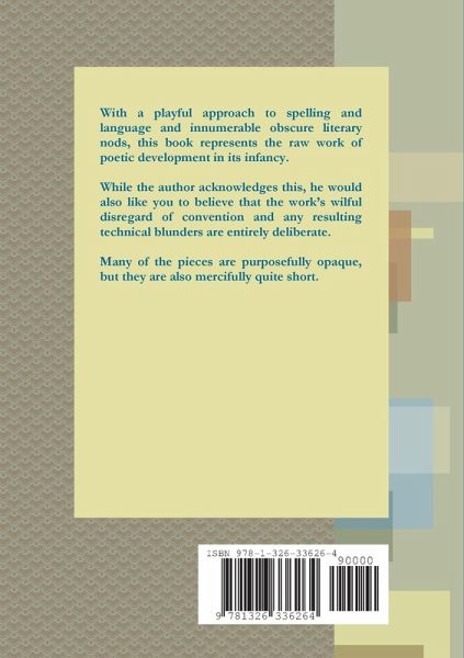 With a playful approach to spelling and language and innumerable obscure literary nods, this book represents the raw work of poetic development in its infancy. While the author acknowledges this, he would also like you to believe that the work's wilful disregard of convention and any resulting technical blunders are entirely deliberate. Many of the pieces are purposefully opaque, but they are also mercifully quite short.
