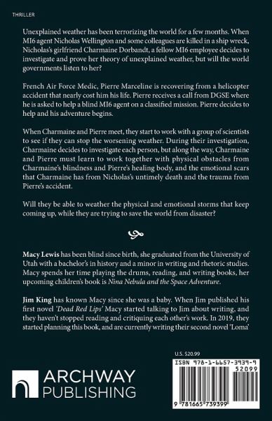Unexplained weather has been terrorizing the world for a few months. When MI6 agent Nicholas Wellington and some colleagues are killed in a ship wreck, Nicholas's girlfriend Charmaine Dorbandt, a fellow MI6 employee decides to investigate and prove her theory of unexplained weather, but will the world governments listen to her? French Air Force Medic, Pierre Marceline is recovering from a helicopter accident that nearly cost him his life. Pierre receives a call from DGSE where he is asked to help a blind MI6 agent on a classified mission. Pierre decides to help and his adventure begins. When Charmaine and Pierre meet, they start to work with a group of scientists to see if they can stop the worsening weather. During their investigation, Charmaine decides to investigate each person, but along the way, Charmaine and Pierre must learn to work together with physical obstacles from Charmaine's blindness and Pierre's healing body, and the emotional scars that Charmaine has from Nicholas's untimely death and the trauma from Pierre's accident. Will they be able to weather the physical and emotional storms that keep coming up, while they are trying to save the world from disaster?