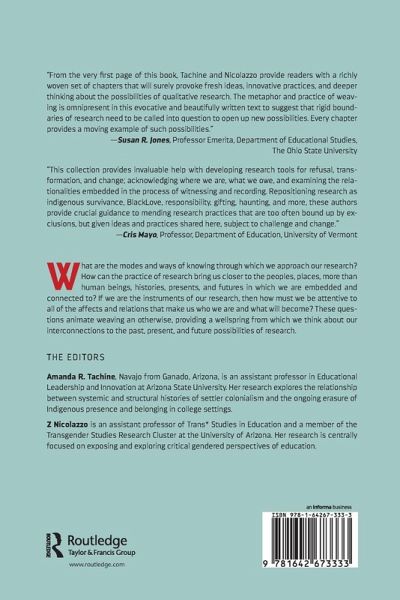 "From the very first page of this book, indeed from the foreword onward, Tachine and Nicolazzo provide readers with a richly woven set of chapters that will surely provoke fresh ideas, innovative practices, and deeper thinking about the possibilities of qualitative research. The metaphor-and practice-of weaving is omnipresent in this evocative and beautifully written text to suggest that rigid boundaries of research need to be called into question to open up new possibilities. Every chapter provides a moving example of such possibilities."