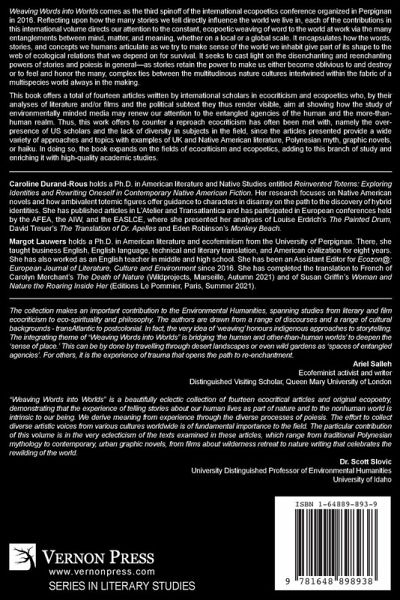 'Weaving Words into Worlds' comes as the third spinoff of the international ecopoetics conference organized in Perpignan in 2016. Reflecting upon how the many stories we tell directly influence the world we live in, each of the contributions in this international volume directs our attention to the constant, ecopoetic weaving of word to the world at work via the many entanglements between mind, matter, and meaning, whether on a local or a global scale. It encapsulates how the words, stories, and concepts we humans articulate as we try to make sense of the world we inhabit give part of its shape to the web of ecological relations that we depend on for survival. It seeks to cast light on the disenchanting and reenchanting powers of stories and poiesis in general-as stories retain the power to make us either become oblivious to and destroy or to feel and honor the many, complex ties between the multitudinous nature cultures intertwined within the fabric of a multispecies world always in the making. This book offers a total of fourteen articles written by international scholars in ecocriticism and ecopoetics who, by their analyses of literature and/or films and the political subtext they thus render visible, aim at showing how the study of environmentally minded media may renew our attention to the entangled agencies of the human and the more-than-human realm. Thus, this work offers to counter a reproach ecocriticism has often been met with, namely the over-presence of US scholars and the lack of diversity in subjects in the field, since the articles presented provide a wide variety of approaches and topics with examples of UK and Native American literature, Polynesian myth, graphic novels, or haiku. In doing so, the book expands on the fields of ecocriticism and ecopoetics, adding to this branch of study and enriching it with high-quality academic studies.