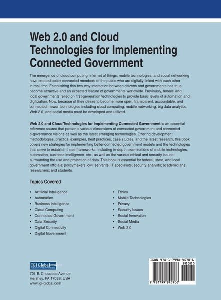 The emergence of cloud computing, internet of things, mobile technologies, and social networking have created better-connected members of the public who are digitally linked with each other in real time. Establishing this two-way interaction between citizens and governments has thus become attractive and an expected feature of governments worldwide. Previously, federal and local governments relied on first-generation technologies to provide basic levels of automation and digitization. Now, because of their desire to become more open, transparent, accountable, and connected, newer technologies including cloud computing, mobile networking, big data analytics, Web 2.0, and social media must be developed and utilized. Web 2.0 and Cloud Technologies for Implementing Connected Government is an essential reference source that presents various dimensions of connected government and connected e-governance visions as well as the latest emerging technologies. Offering development methodologies, practical examples, best practices, case studies, and the latest research, this book covers new strategies for implementing better-connected government models and the technologies that serve to establish these frameworks, including in-depth examinations of mobile technologies, automation, business intelligence, etc. as well as the various ethical and security issues surrounding the use and protection of data. This book is essential for federal, state, and local government officials; policymakers; civil servants; IT specialists; security analysts; academicians; researchers; and students.