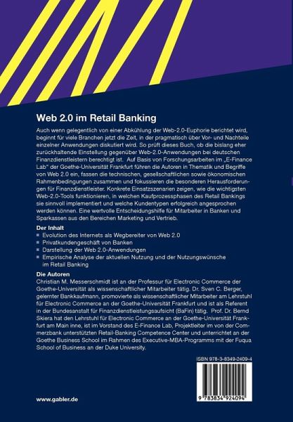 Auf Basis von Forschungsarbeiten im ¿E-Finance Lab¿ im ¿House of Finance¿ der Goethe-Uni Frankfurt führen die Autoren in Thematik und Begriffe von Web 2.0 ein, fassen die technischen, gesellschaftlichen sowie ökonomischen Rahmenbedingungen zusammen und arbeiten die besonderen Herausforderungen für Finanzdienstleister heraus, die diese von anderen Branchen unterscheidet. Den Kern des Buches bildet die strukturierte Darstellung von Web-2.0-Anwendungen mit konkreten Hinweisen für oder wider den sinnvollen Einsatz im Retail Banking.
