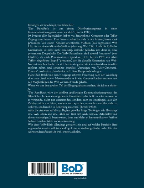 Benötigen wir überhaupt eine Ethik 2.0?"Der Rundfunk ist aus einem Distributionsapparat in einen Kommunikationsapparat zu verwandeln" (Brecht 1932).99 Prozent aller Jugendlichen haben via Smartphone, Computer oder Tablet Zugang zum Internet. Das Internet selbst hat sich in den letzten Jahren stark gewandelt: Von einem Konsum-orientierten Medium (das sogenannte Web 1.0), hin zu einem Mitmach-Medium (dem sog. Web 2.0 ). Auch die Rolle der Nutzerinnen ist nicht mehr eindeutig, vielmehr befinden sich diese in einer permanente Doppelrolle: Die Web-Nutzerinnen sind sowohl "consumer" (von Inhalten), als auch Produzentinnen (producer). Der bereits 1984 von Alvin Toffler eingeführte Begriff "prosumer", der die aktuelle Generation von Web-Nutzerinnen beschreibt, die sich bereits ein gutes Stück von den Massenmedien entfernt haben und scheinbar mühelos Unmengen von "User-Generated-Content" produzieren, beschreibt m.E. diese Doppelrolle sehr gut. Hätte Bert Brecht mit seiner eingangs zitierten Forderung nach der Wandlung eines rein distributiven Massenmediums in ein Kommunikationsmedium, mit den Möglichkeiten des Web 2.0 seine Freude gehabt? Wenn wir uns den zweiten Teil des Eingangszitates ansehen, bin ich mir sicher: Ja."Der Rundfunk wäre der denkbar großartigste Kommunikationsapparat des öffentlichen Lebens, ein ungeheures Kanalsystem, das heißt, er wäre es, wenn er es verstünde, nicht nur auszusenden, sondern auch zu empfangen, also den Zuhörer nicht nur hören, sondern auch sprechen zu machen und ihn nicht zu isolieren, sondern ihn in Beziehung zu setzen" (Brecht 1932).Auch die Antwort auf die zu Beginn gestellte Frage "Benötigen wir überhaupt eine Web Ethik, also eine Ethik 2.0" lässt sich nach meinem Dafürhalten mit einem eindeutigen Ja beantworten, denn ein Mehr an kommunikativer Freiheit bedeutet auch in Mehr an Verantwortung.Wie diese Web-Ethik allerdings gestaltet sein und auf welche Bereiche diese angewendet werden soll, ist allerdings keine so eindeutige Sache mehr. Für eine Antwort darauf muss ich wohl weiter ausholen.