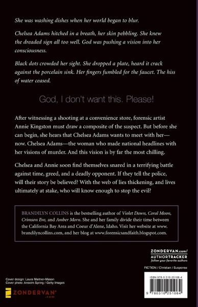 She was washing dishes when her world began to blur. Chelsea Adams hitched in a breath, her skin pebbling. She knew the dreaded sign all too well. God was pushing a vision into her consciousness. Black dots crowded her sight. She dropped a plate, heard it crack against the porcelain sink. Her fingers fumbled for the faucet. The hiss of water ceased. God, I don't want this. Please! After witnessing a shooting at a convenience store, forensic artist Annie Kingston must draw a composite of the suspect. But before she can begin, she hears that Chelsea Adams wants to meet with her---now. Chelsea Adams---the woman who made national headlines with her visions of murder. And this vision is by far the most chilling. Chelsea and Annie soon find themselves snared in a terrifying battle against time, greed, and a deadly opponent. If they tell the police, will their story be believed? With the web of lies thickening, and lives ultimately at stake, who will know enough to stop the evil?