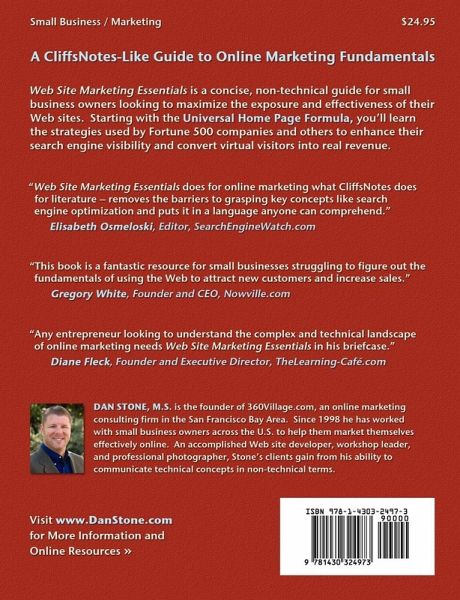 Web Site Marketing Essentials is a concise, non-technical guide for small business owners looking to maximize the exposure and effectiveness of their Web sites. Starting with the Universal Home Page Formula, you'll learn the strategies used by Fortune 500 companies and others to enhance their search engine visibility and convert virtual visitors into real revenue. Key topics include search engine optimization (SEO), strategic domain name usage, starting-out in e-commerce, business blogging basics, and tactics to attract local consumers.