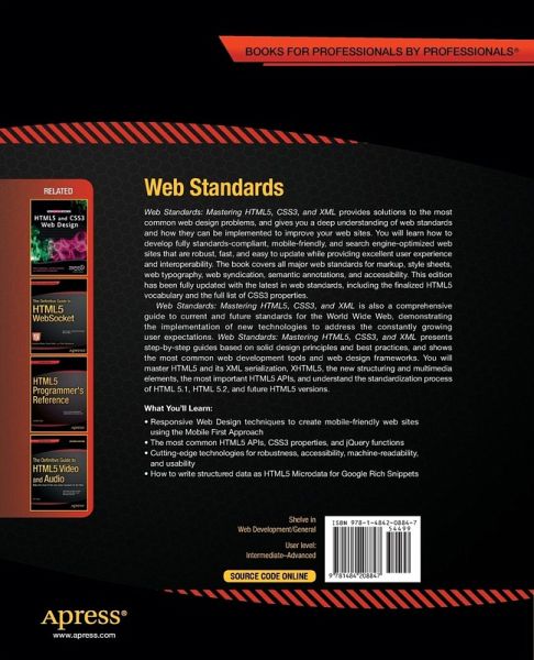 Web Standards: Mastering HTML5, CSS3, and XML provides solutions to the most common web design problems, and gives you a deep understanding of web standards and how they can be implemented to improve your web sites. You will learn how to develop fully standards-compliant, mobile-friendly, and search engine-optimized web sites that are robust, fast, and easy to update while providing excellent user experience and interoperability. The book covers all major web standards for markup, style sheets, web typography, web syndication, semantic annotations, and accessibility. This edition has been fully updated with the latest in web standards, including the finalized HTML5 vocabulary and the full list of CSS3 properties.