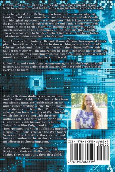 The enslaved king of 22nd Century cyberspace has come of age and seeks to regain control of his life and escape his father's cybernetics lab. Since babyhood, Alex McGregor has been the human host of an AI, Sander, thanks to a man-made retrovirus that converted Alex's cells into biological supercomputer components. This is kept a secret, lest the public deem him a high-tech zombie and panic. Sander remotely operates most of Earth's machines, including ones providing vital societal services. In one of his many online locations, the AI thinks like a teen boy, goes by Sander Michael Gabrielson, and has a foster dad who loves him as his foster bro's equal. Now Alex's technophobic girlfriend, Manna Jenkins, has inspired Alex's plot to break free of his brainwashing scripts, escape his bio-dad's cybernetics lab, and uninstall Sander from their shared offline body. Sander fears this will kill Alex and render his prosthetic brain inoperable. He seeks relationship counseling with his foster bro, Elisha, a conservative ministry student hiding that he's intersexed. Unless Alex and Sander can become one again, Sander's upgrade will go awry and cause a global tech catastrophe that could prove fatal to everyone he loves.