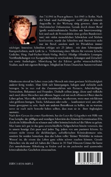 Menschen wie du und ich können in 30 Fünf Minuten-Crimes Ablenkung finden und in ein spannendes, kriminalistisches Geschehen eintauchen, denn mindestens einmal im Leben muss jeder Mensch mit einer gewissen Schlitzohrigkeit anderer fertig werden. Man fühlt sich hintergangen, belogen und vielleicht auch betrogen. Man sollte mit offenen Augen und mit noch offeneren Ohren durchs Leben gehen, sollte erkennen, wenn man mit kleinen oder größeren Intrigen, Tricks, Schikanen oder mehr ¿ konfrontiert wird, um selbst besser gewappnet zu sein. Auch um andere Betroffene zu warnen, wenn man sie in ihrer Arglosigkeit ausnutzt. Nach dem Genuss des ersten Kurzkrimis hat der Leser die Gelegenheit mit Hilfe von Frau Lempke, der pfiffigen und wendigen Sekretärin des Kriminal-Kommissariats II b, durch ein Schlüsselloch zu schauen und selbst kriminalistisch auf die Fährte zu gehen. Sie werden bemerken, dass das Leben voller 'kleiner Webfehler in weissen Westen' ist.