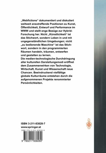 Web-Entwicklung ist ein global betriebenes Kulturen-Projekt. "Web-Fictions" versammelt weltweit agierende Vertreter der Spitzengruppe zur Erforschung und Entwicklung von avancierten computerintegrierten Medienräumen. Medien- und computerwissenschaftliche, künstlerische und designerische sowie kommunikationswissenschaftliche Entwicklungsoptionen und Probleme werden vorgestellt und ausführlich besprochen. Sinnliche Qualität, Multisensorik, open source, globale Öffentlichkeit, virtuelle Wissensräume und inhärente, web-spezifische Qualitätssicherung kommen dabei zur Sprache.