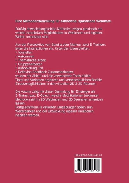 Eine Methodensammlung für zahlreiche, spannende Webinare. Fünfzig abwechslungsreiche Methoden zeigen praxisnah auf, welche interaktiven Möglichkeiten in Webinaren und digitalen Welten umsetzbar sind. Aus der Perspektive von Sandra oder Markus, zwei E-Trainern, leiten die Interaktionen ein. Unter den Überschriften: + Vorstellen+ Ankommen+ Thematische Arbeit + Gruppenarbeiten+ Auflockerung und + Reflexion-Feedback-Zusammenfassenwerden der Ablauf und die verwendeten Tools erklärt.Tipps und Varianten ergänzen und veranschaulichen flexible Einsatzmöglichkeiten in den virtuellen 2D & 3D Räumen. Die Autorin zeigt mit dieser Sammlung für Einsteiger als E-Trainer bzw. E-Coach, welche Modifikationen bekannter Methoden sich in 2D Webinaren und 3D Szenarien umsetzen lassen. Fortgeschrittene in virtuellen Umgebungen sollen zum Weiterdenken und der Entwicklung eigener Kreationen inspiriert werden.