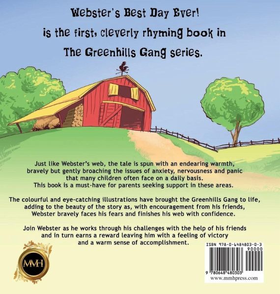 ‘Webster’s Best Day Ever!’ is the first, clever rhyming book in The Greenhills Gang series. Just like Webster’s web, the story is spun with endearing warmth, bravely but gently broaching the issues of anxiety, nervousness and panic that many children often face on a daily basis. This book is a must-have for parents seeking support in these areas. The colourful and eye-catching illustrations have brought the Greenhills Gang to life, adding to the beauty of the story as, with encouragement from his friends, Webster bravely faces his fears and finishes his web with confidence. Join Webster as he works through his challenges with the help of his friends and in turn earns a reward, leaving him with a feeling of victory and a warm sense of accomplishment.