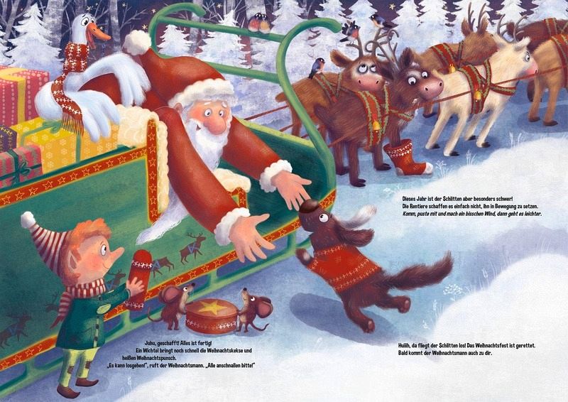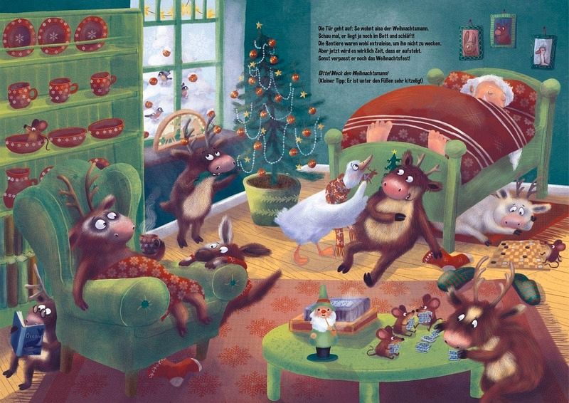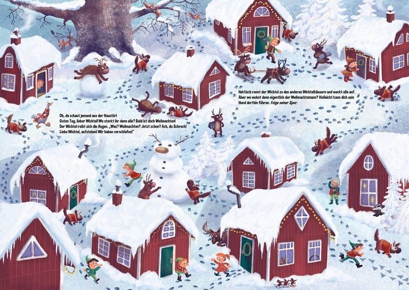 So gehen wir mit den Rentieren und einigen anderen tierischen Freunden auf die Suche. Wir helfen in dem wir laut Wichtel und Weihnachtsmann rufen, wir folgen einer Schnüffelnasenspur, klopfen an Türen. Die Wichtel sind schnell geweckt, doch beim Weihnachtsmann da müssen wir schon etwas mehr machen, um ihn zu wecken. Ob Kitzeln vielleicht hilft?