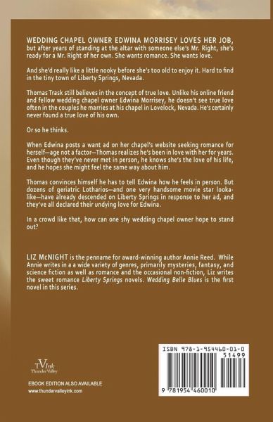 Wedding chapel owner Edwina Morrisey loves her job, but after years of standing at the altar with someone else's Mr. Right, she's ready for a Mr. Right of her own. She wants romance. She wants love. And she'd really like a little nooky before she's too old to enjoy it. Hard to find in the tiny town of Liberty Springs, Nevada. Thomas Trask still believes in the concept of true love. Unlike his online friend and fellow wedding chapel owner Edwina Morrisey, he doesn't see true love often in the couples he marries at his chapel in Lovelock, Nevada. He's certainly never found a true love of his own. Or so he thinks. When Edwina posts a want ad on her chapel's website seeking romance for herself-age not a factor-Thomas realizes he's been in love with her for years. Even though they've never met in person, he's certain she's the love of his life, and he hopes she might feel the same way about him. Thomas convinces himself he has to tell Edwina how he feels in person. But dozens of geriatric Lotharios-and one very handsome movie star lookalike-have already descended on Liberty Springs in response to her ad, and they've all declared their undying love for Edwina. In a crowd like that, how can one shy wedding chapel owner hope to stand out?
