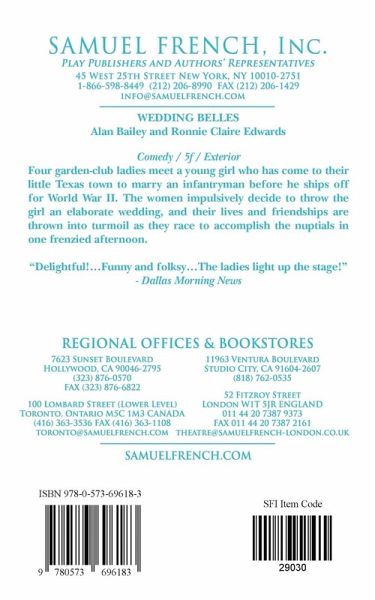 5f / Comedy / Exterior Four garden-club ladies meet a young girl who has come to their little Texas town to marry an infantryman before he ships off for World War II. The women impulsively decide to throw the girl an elaborate wedding, and their lives and friendships are thrown into turmoil as they race to accomplish the nuptials in one frenzied afternoon. "Delightful! ... Funny and folksy ... The ladies light up the stage!" - Dallas Morning News