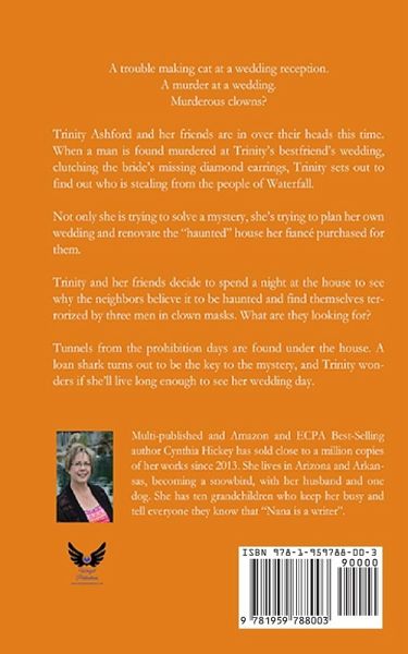 A trouble making cat at a wedding reception. A murder at a wedding. Murderous clowns? Trinity Ashford and her friends are in over their heads this time. When a man is found murdered at Trinity's bestfriend's wedding, clutching the bride's missing diamond earrings, Trinity sets out to find out who is stealing from the people of Waterfall. Not only she is trying to solve a mystery, she's trying to plan her own wedding and renovate the "haunted" house her fiancé purchased for them. Trinity and her friends decide to spend a night at the house to see why the neighbors believe it to be haunted and find themselves terrorized by three men in clown masks. What are they looking for? Tunnels from the prohibition days are found under the house. A loan shark turns out to be the key to the mystery, and Trinity wonders if she'll live long enough to see her wedding day. Join this quirky group as they embark on another adventure...maybe their deadliest one yet.