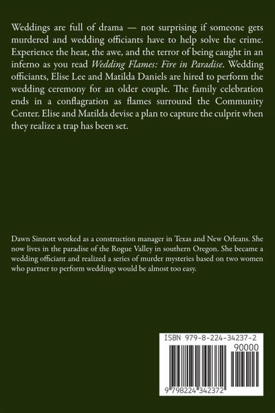 Weddings are full of drama - not surprising if someone gets murdered and wedding officiants have to help solve the crime. Experience the heat, the awe, and the terror of being caught in an inferno as you read Wedding Flames: Fire in Paradise. Wedding officiants, Elise Lee and Matilda Daniels are hired to perform the wedding ceremony for an older couple. The family celebration ends in a conflagration as flames surround the Community Center. Elise and Matilda devise a plan to capture the culprit when they realize a trap has been set.
