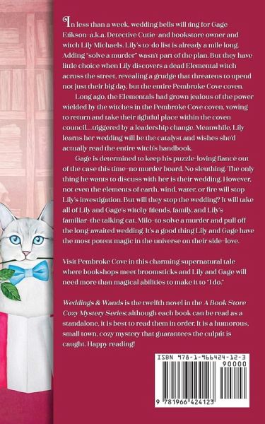 Enjoy this witty, small town paranormal, cozy mystery by award-winning and bestselling author Lucinda Race. Welcome to Pembroke Cove, where witches and murders are multiplying... In less than a week, wedding bells will ring for Gage Erikson-a.k.a. Detective Cutie-and bookstore owner and witch Lily Michaels. Lily's to-do list is already a mile long. Adding "solve a murder" wasn't part of the plan. But they have little choice when Lily discovers a dead Elemental witch across the street, revealing a grudge that threatens to upend not just their big day, but the entire Pembroke Cove coven. Long ago, the Elementals had grown jealous of the power wielded by the witches in the Pembroke Cove coven, vowing to return and take their rightful place within the coven council...triggered by a leadership change. Meanwhile, Lily learns her wedding will be the catalyst and wishes she'd actually read the entire witch's handbook. Gage is determined to keep his puzzle-loving fiancé out of the case this time-no murder board. No sleuthing. The only thing he wants to discuss with her is their wedding. However, not even the elements of earth, wind, water, or fire will stop Lily's investigation. But will they stop the wedding? It will take all of Lily and Gage's witchy friends, family, and Lily's familiar-the talking cat, Milo-to solve a murder and pull off the long-awaited wedding. It's a good thing Lily and Gage have the most potent magic in the universe on their side-love. *** Visit Pembroke Cove in this charming supernatural tale where bookshops meet broomsticks and Lily and Gage will need more than magical abilities to make it to "I do." Weddings & Wands is the twelfth novel in the A Book Store Cozy Mystery Series; although each book can be read as a standalone, it is best to read them in order. It is a humorous, small town, cozy mystery that guarantees the culprit is caught. Happy reading!