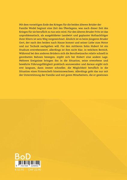 Mit dem vorzeitigen Ende des Krieges für die beiden älteren Brüder der Familie Wedel beginnt eine Zeit des Überlegens, was nach dieser Zeit des Krieges für sie beruflich zu tun sein wird. Für den älteren Bruder Fritz ist das unproblematisch, als ausgebildeter Landwirt und geplanter Hofnachfolger ihrer Eltern ist sein Weg vorgezeichnet. Ähnlich ist es beim jüngeren Bruder Gert, der nach den beiden nach Hause kommt und seiner Liebe zum Motor und zur Technik nachgehen will. Für den mittleren Sohn Hubert Ist ein Studium erstrebenswert, allerdings ist ihm nicht klar, in welchem Bereich. Während bei den anderen Brüdern sich die Berufswünsche relativ schnell in geordneten Bahnen bewegen, ergibt sich bei Hubert eine andere Lage. Mehrere Ereignisse bringen ihn in die Situation, seine erworbene und bewährte Führungsfähigkeit praktisch anzuwenden und daraus ergibt sich erst langsam, dann immer schneller, die Möglichkeit beruflich in die Situation eines Firmenchefs hineinzuwachsen. Allerdings geht das nur mit der Unterstützung der Familie und mit guten Mitarbeitern, die er gewinnen kann.